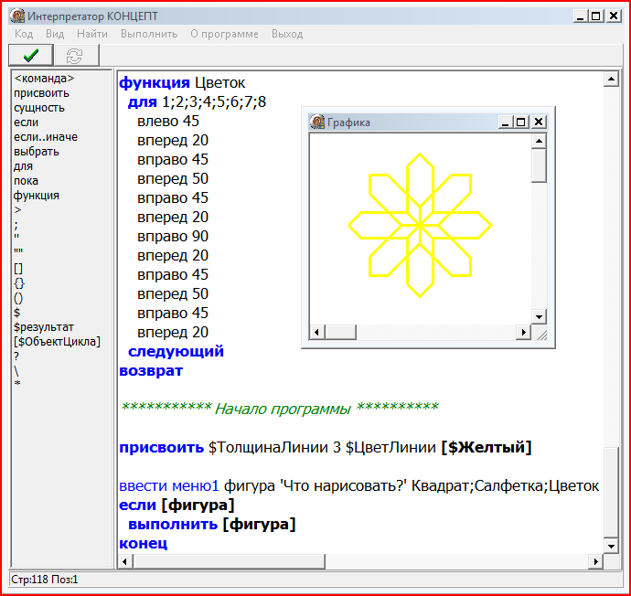По поводу языка ДРАКОН. Для Владимир2012 . Дракон - интересный подход и проект, доведенный до практической реализации. Но это графический язык на основе блок-схем (кому-то нравится, кому-то удобно рисовать, а не писать). Одно очевидное сходство с КОНЦЕПТ, которое я вижу, - это использование кириллицы. Другое, менее очевидное, это то, что в Драконе есть форма отображения блок-схем алгоритмов в виде текста на псевдокоде. Когда задумывался КОНЦЕПТ, я также уделял важное внимание этой теме: естественный и плавный переход от псевдокода к работающему (выполгнимому) программному коду. Идея предварительного описания алгоритма на псевдокоде в нынешние времена отошла на второй план. Это вызвано тем, что сейчас в программировании более 90% работы (создание экранных форм, подключения обработчиков событий, разработка структуры БД, передача данных из БД в формы и обратно, всякие API и т.д.) не связано с разработкой новых алгоритмов. Кроме того, многие алгоритмы обработки структур данных (например, работа с деревьями) уже реализованы в готовых библиотеках. Т.к. КОНЦЕПТ задумывался именно для целей прототипирования и отработки новых алгоритмов, то реализация плавного перехода от псевдокода к работающей программе для него важно. И это получилось. Ниже пример исполнимого программного кода (можно выполнить в интерпретаторе КОНЦЕПТ), который по-сути является и псевдокодом. Код: html 1. 2. 3. 4. 5. 6. 7. 8. 9. 10. 11. 12. 13. 14. Таким образом, пример выше - одновременно и псевдокод и программа. Такой результат не получится достичь естественным образом в C++, Java или Pascal. Вам придется все переписать (закодировать) на выбранном ЯП, а то, что касается псевдокода, поместить в комментарий. ... |