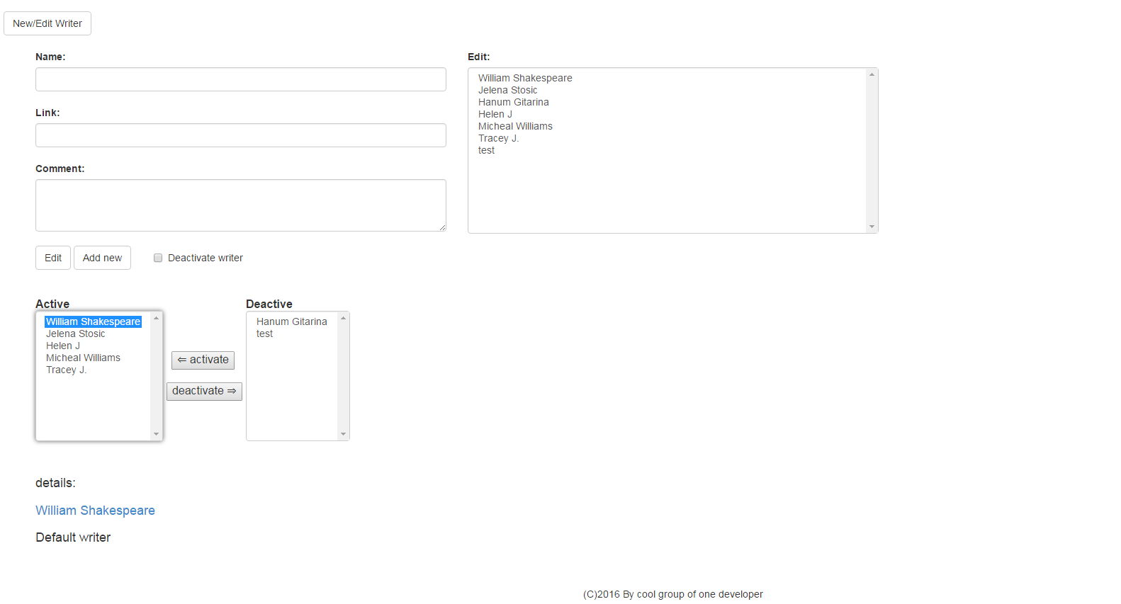 Спасибо, так быстро много ответов :) ide - IntelliJ IDEA 15 jspf - почитаю, что это и как работать Даты в java8 хотел, но так как сделал на hibernate 4, то они не хотят нормально работать с DB, а при обновлении на hibernate 5, все полетело, целый день пытался вернуть, но в итоге все равно восстановился с бекапа, решил java 8 и hibernate 5 оставить на следующий раз, когда буду переписывать этот проект под spring. Если такой подход не верен, напишите, буду пробовать перейти на этом проекте.. стили - принято, сделаю имена классов - это bootstrap о обработке событий немного не понял, имеется ввиду функционал взятия из базы данных в сервлете вынести из doGet в отдельный метод? ... |