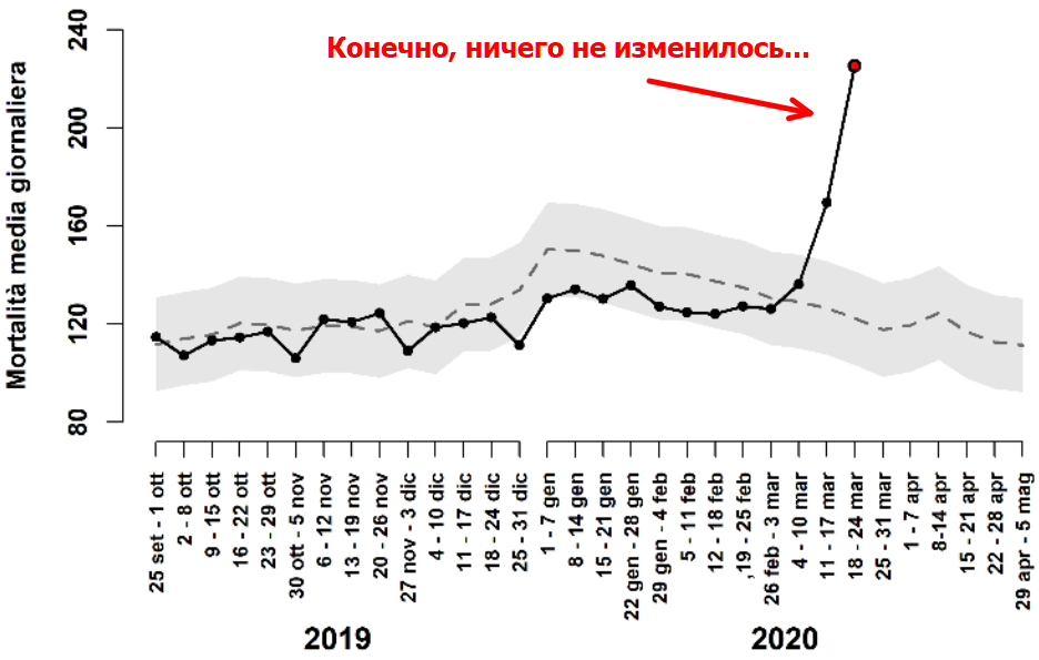 Biitskiy 05.04.2020, 09:52 alexeyvg, А есть график вообще смертности в Италии за период с 01.01.2018 по сегодняшний день? Вы увидите там синусоиду, причем сейчас смертность меньше, чем была раньше. Грипп убивает ежегодно в мире до 650 тысяч человек. Ряд стран ничего не стали предпринимать из-за короновируса, и там нет ухудшения ситуации. Это европейская система эпидемиологического мониторинга, итальянская часть этого мониторинга (есть ссылки на общую). То есть это не воззвания политиков, видосы блоггеров, ужастики от СМИ, а нормальные данные, которым можно доверять. Все регистрации смертей из каждой страны передаются туда в реальном времени; причины, как правило, не указываются (потому что они неизвестны), данных там минимум - но зато они получаются сразу. Сайт самой системы: http://www.salute.gov.it/portale/caldo/dettaglioContenutiCaldo.jsp?id=4547&area=emergenzaCaldo&menu=vuoto Суммарные данные, обновляемый PDF: http://www.salute.gov.it/portale/caldo/SISMG_sintesi_ULTIMO.pdf Более подробные данные, по регионам, полу, и т.д., обновляемый PDF: http://www.deplazio.net/images/stories/SISMG/SISMG_COVID19.pdf Публикуемые данные отстают от реального времени на несколько дней (агрегируется по неделям, выкладывают в середине недели за прошлую неделю). ... |