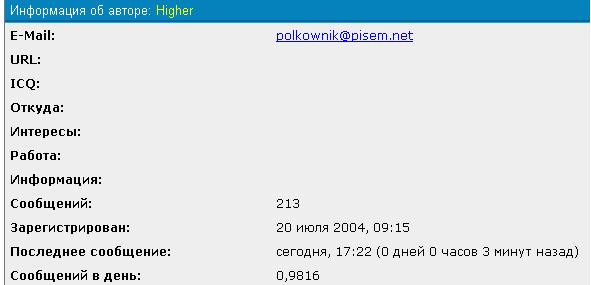 Higher Спор на форуме, это всё равно что олимпиада среди умственно отсталых. Даже если ты победил, ты всё равно долбоеб. (Острие-ру) ... |