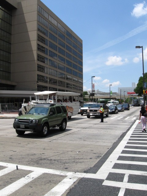 Дошёл до перекрёстка с исторической городской артерией. Камера случайно захватила достопримечательность многих американских городов туристическую машину амфибию (на заднем плане) ... |