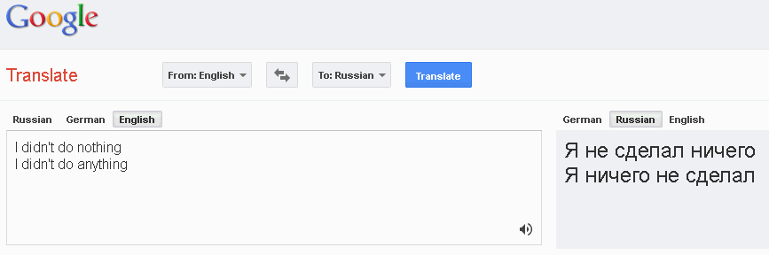 Да, кстати, вот ещё про отрицания: I can't do nothing = Я не могу ничего не делать 2 vs 3 ... |