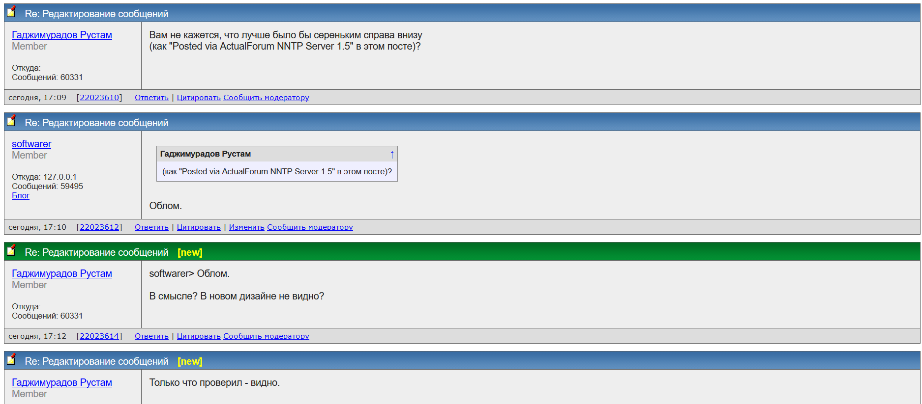 softwarer, У меня с цитированием беда . Поэтому так напишу . Подумав , соглашусь с Вами по пятому вопросу . Вероятность вреда от невозможности исправить сообщение превышает вероятность порчи контента ответом на изменённое сообщение . ... |