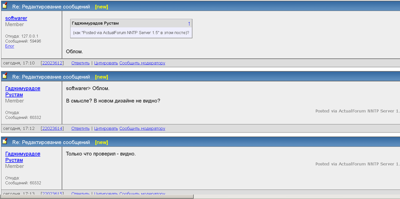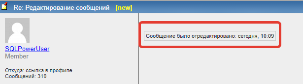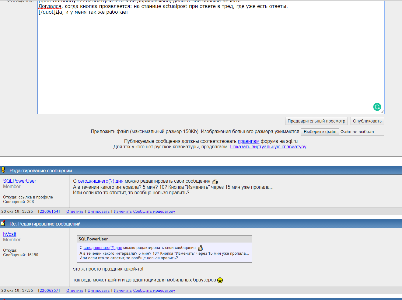 SQLPowerUser С сегодняшнего(?) дня можно редактировать свои сообщенияА в течении какого интервала? 5 мин? 10? Кнопка "Изменить" через 15 мин уже пропала... Или если кто-то ответит, то вообще нельзя править? так ведь может дойти и до адаптации для мобильных браузеров :))) ... |
