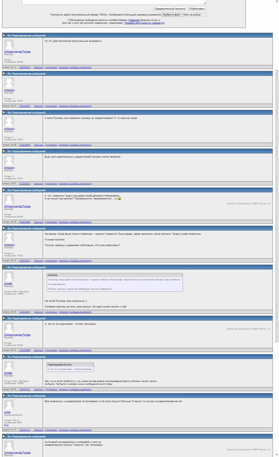 вадя 07.09.2020, 20:10 dmidek 06.09.2020, 10:20 Как Вы сами заметили, вопрос существует вне зависимости от моего предложения. В любом случае через 10 минут вероятность подобной коллизии снижается и чем дальше, тем круче. при редактирование не ограничивать время (или ограничивать достаточно большим...) но во время редактирования - отобразить если кто-то написал сообщение во время редактирования и редактирующий сам принимает решение - отправлять изменения или нет. websocket позволяет это сделать... :))) :))) :))) :))) :))) :))) :))) очень нужная идея . Если важно , чтобы никто не написал, сделайте workaround - откройте вторую вкладку и гляньте перед отправкой . А по поводу неограниченного времени ... по - моему это случай выхолащивания полезной идеи . Исправить ошибку в посте , добавить аргумент , решиться и стереть написанное - полезные , хорошие вещи ... но лишь в реальном времени . Устремлённые в бесконечность в неумных руках они ведут к абсурду, а то и просто вредят . ... |