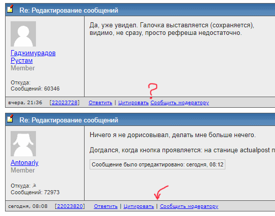 но можно непросто сделать сообщение что изменено, а выделить изменения тогда будет видно что есть что . тут можно продолжить улучшения с редактированием - и есть спортивный интерес увидеть идеальное общение в форуме. вопрос - насколько это можно реализовать в конкретном движке. и насколько можно найти компромисс между всеми участниками (при условии, что любые фантазии на данную тему будут реализованы) ... |