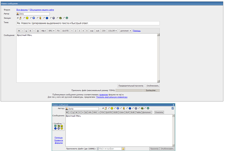 Алекс, а почему при "Ответ" поле ввода сверху, а при "Цитировать" - снизу? И контрол+энтер не работает. ... |