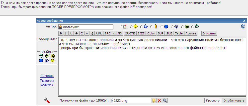 В опере версии 11.11 почему-то не постит набранный текст. На экране навечно остается крутиться колесико с сообщением, что информация отправляется. После снятия галочки быстрого ответа в профиле всё начинает поститься. ... |