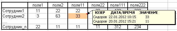 Victor256, Я в проектировании БД не ас но попробую предложить свой упрощенный вариант: users ( id , name) employee ( id , name, ...) Таблица сотрудников tablebuh ( id , IDemployee , date, field1, field2, field3) - Твоя таблица(field1 - для бухгалтера, field2 - для начальника, field3 - рассчитывается) field1History ( id , datetime, IDtsblebuh , val, IDuser) - Таблица истории изменений для field1 field2History ( id , datetime, IDtsblebuh , val, IDuser) - Таблица истории изменений для field2, при правке поля field2, триггером заносить сюда дату, время, предыдущего значения. Надеюсь понятно представил. ... |
