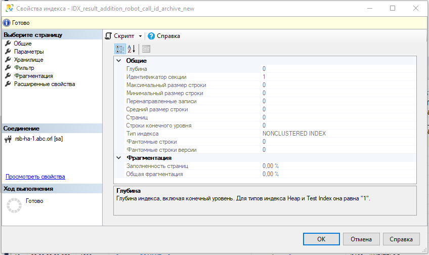 Отсутствует информация на странице "Фрагментация" свойств индекса