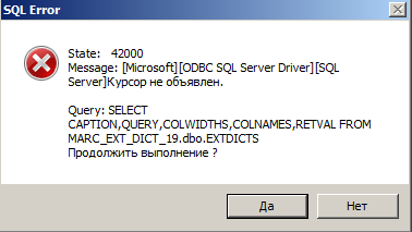 Добрый день! Вы в ваш Библиотечный каталогизатор МАРК-SQL ходите под определенным пользователем, этот пользователь указан в настройках соединения программы Библиотечный каталогизатор МАРК-SQL. Компания Майкрософт говорит по Вашей ошибке, что у пользователя нет прав на базу данных. https://support.microsoft.com/ru-ru/topic/40002-37000-microsoft-odbc-driver-sql-server-sql-server-курсор-не-объявлен-ba09fa41-5079-cd3f-37cd-f30e103cdec1 ... |