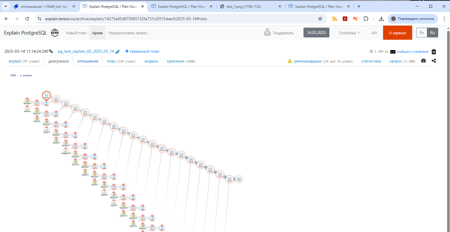 ef1 [игнорируется] Восстановил прежний логин, ArtToms был временный. Пытаюсь понять зачем в первом запросе внутреннее соединение заменили на left join LSDBO.attrib_value? Я специально обернул внешние соединения в cross join lateral, заменив на внутренние. Так возросла скорость и "выправился" план запросов. По поводу повторов. Проанализировал исходный запрос, можно попробовать вариант с временными таблицами. Первый запрос во временную таблицу. Отбираем записи из attrib_value, с av.attrib_id перечисленными в исходном запросе. Условие where av.attrib_id in (.....), я привел для примера, лучше сделать join из значений. Код: SQL 1. 2. 3. 4. К таблицам БД, будет всего 4 запроса, остальное с временными. Вместо временных можно попробовать cte Написал очень упрощенно, если интересно, поясню подробнее, можно пообщаться и голосом. ... |
