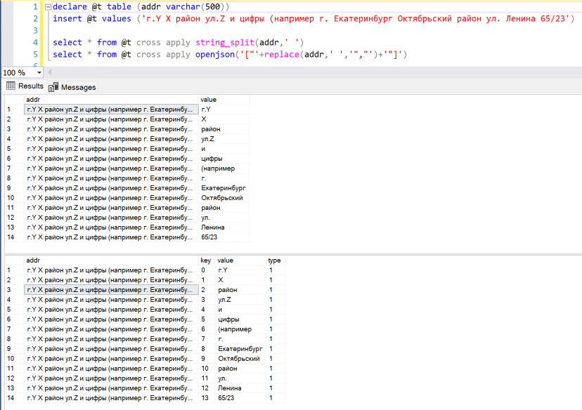 Ksenia [игнорируется] я попробовала разбить строку по 'названиям', но не могу вывести нужные SELECT p,name,DATA FROM (SELECT p,name, Split.a.value('.', 'NVARCHAR(MAX)') AS DATA FROM (SELECT peple, id AS p,Name,CAST('<X>'+REPLACE([Address], ',', '</X><X>')+'</X>' AS XML) AS String FROM [PeopleSet] ) AS A CROSS APPLY String.nodes('/X') AS Split(a)) AS pop пытаюсь вывести через через PATINDEX показывает все как надо но вырезать не получается ... |