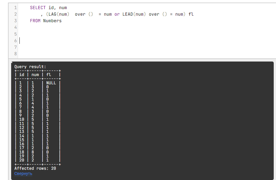CerebroSQL [игнорируется] Спасибо! Но это решило задачу - схлопывается "двойка", а она - с прерыванием идёт. Повозилась ещё, да, ROW_NUMBER не уйти, но вот только если применить после флажков. В общем, получается громоздко, и на мой взгляд с переменными нагляднее. select num from( select id, num, fl , id - row_number() over (partition by num order by id) r from ( SELECT id, num , (LAG(num) over () = num or LEAD(num) over () = num) fl FROM Numbers ) s where fl=1 ) ss group by 1 having count(*) >= 3 and count(distinct(r))=1 ... |