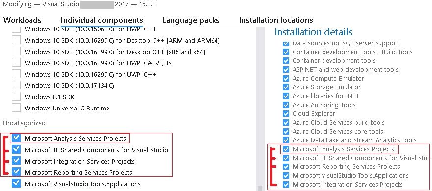 раньше у меня был установлен полный пакет SQL Server 2008 - всё работало. Там был Sql Server Data Tools, прямо в меню "пуск" в одной из папок. сейчас - не понятно. SSAS установлен, а инструмента для создания проекта куба нет. прочитал, что он перемещён в установщик Visual Studio. Запустил установщик VS2017, выбрал в установщике галочку (см. скриншот). Запускаю студию - среди проектов её нет. Ищу "Data Tools" в пуске - не нахожу. Что я делаю не так? ... |