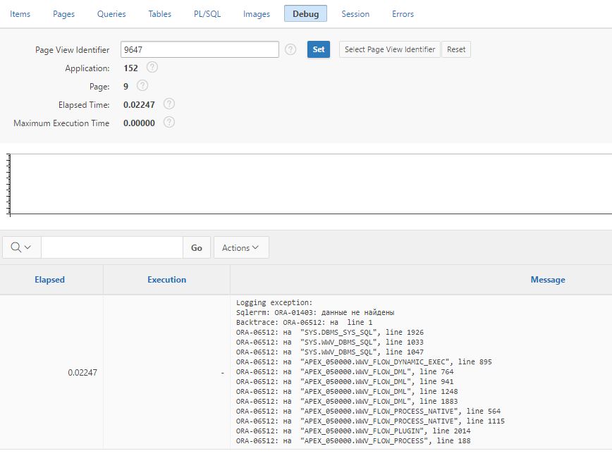 Хочу запросА как увидеть запрос, который выполнялся в БД?1. Средствами СУБД 2. Логинитесь в апексе, запускаете из него приложение, у него внизу должна появиться панель с кнопками управления дебагом. Включаете дебаг кнопкой "Debug", потом выполняете нужное действие, потом нажимаете "View debug", в появившемся окне на закладке "Debug" указываете номер интересующего приложения и страницы, потом наблюдаете такую картинку, как во вложении. Там будут перечислены все процессы, которые выполнялись в процессе создания страницы, в том числе SQL и PL/SQL код. ... |