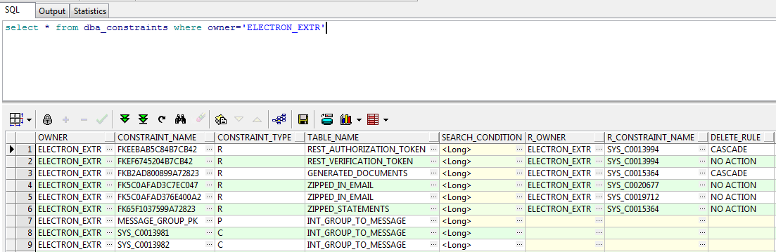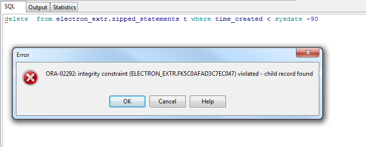 tru55, Вы удаляете по дате (старше), а констраинт не по дате CONSTRAINT "FK5C0AFAD3C7EC047" FOREIGN KEY ("ZIPPED_FILE_ID") REFERENCES "ELECTRON_EXTR"."ZIPPED_STATEMENTS" ("ID") ENABLE, CONSTRAINT "FK5C0AFAD376E400A2" FOREIGN KEY ("EMAIL_SENT_ID") REFERENCES "ELECTRON_EXTR"."EMAIL_STATUS" ("ID") ENABLE оно и правильно слетает (могло случайно не слетать) проверить select id from A a where dat<sysdate-90 and exists (select 1 from B b where b.dat<sysdate-90 and b.id=a.id) ..... stax ... |