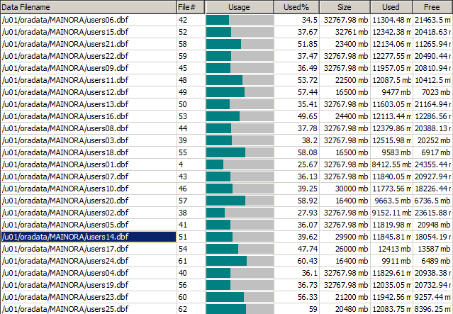 maverick2104Как видно много .dbf файлов которые даже на половину не заполненыПоэтому я даю датафайлам расширение .semiempty. А в табличных пространствах, где файлы наполовину полны - .semifull. ... |