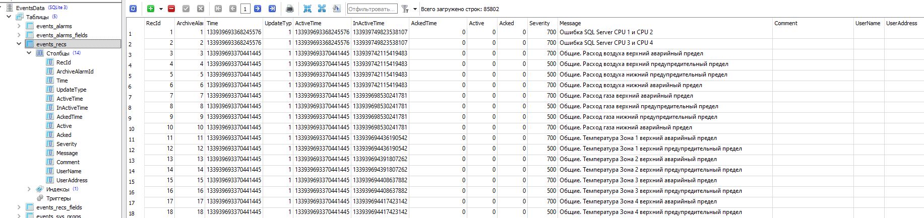 Добрый день. Есть база данных PostgreSQL переконвертирована с SQLite. База хранит архив сообщений с MasterSCADA 4D 1.3. Для наглядности снимок с БД SQLite открытой с помощью SQLiteStudio (скрин) Задача: мне нужно по определённой дате найти строки. Столбец Time имеет тип данных BIGINT . Вопрос: как мне перевести целочисленное значение в читаемое ДД:ММ:ГГГГ:ЧЧ:ММ:СС и найти нужные записи не убив базу для MasterSCADA 4D 1.3.? Я в PostgreSQL полный рак Спасибо! PostgreSQL 18 pgAdmin 4: Version 9.12 Python Version 3.13.12 Electron Version 35.4.0 ... |