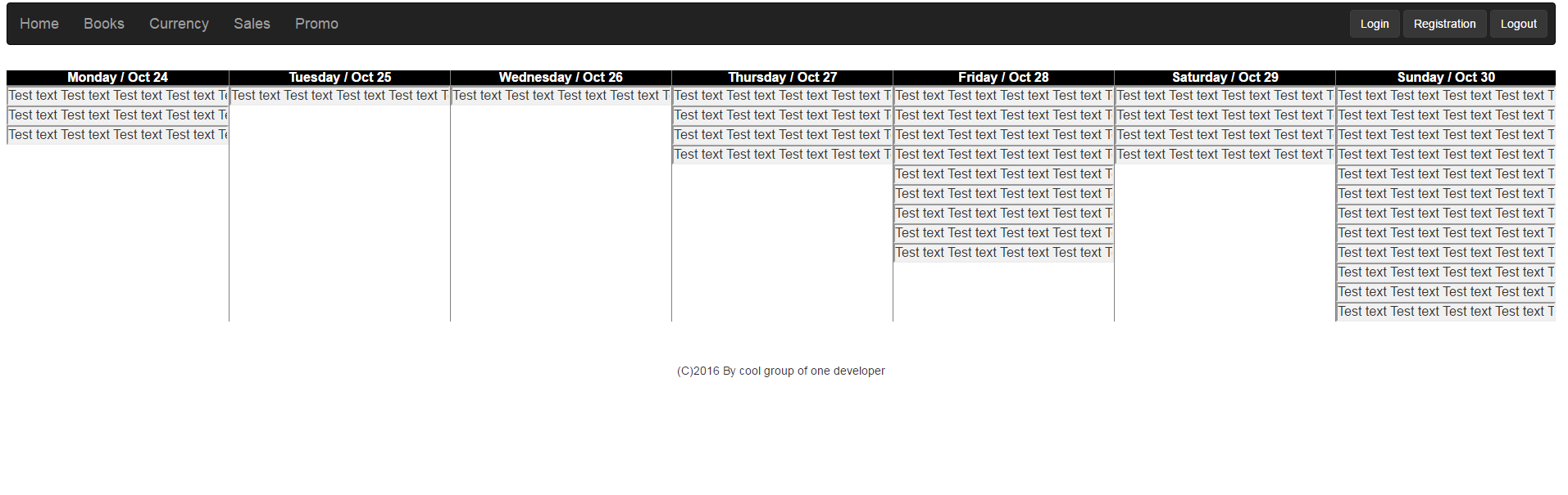Petro123liberumЗаменить таблицу на компонент библиотечную это как? типа http://www.jtable.org/ Слишком избыточно.. Кроме того не уверен, что смогу ее заполнить. Заполняется сначала столбик понедельника, потом вторника и т.д. В моем случаи вид таблицы делается с помощью css, а сама таблица имеет всего 2 строки, первая - заглавие, вторая данные на весь день недели. ... |