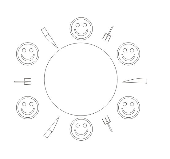 За круглым столом сидит 6 философов, перед каждым тарелка с едой, по сторонам у каждого философа вилка и нож, всего 3 ножа и 3 вилки. То есть последовательность - философ-вилка-философ-нож-философ-вилка- и т.д. Что бы поесть философ должен взять вилку и нож в руки, если нет вилки или ножа, философ ждет недостающий прибор, поев философ освобождает приборы. Проблема в понимании как это сделать в принципе. Я так понимаю должна быть сущность философ, у которого должны быть правая и левая рука, так, как вилка-нож идут по очереди, не важно, что он берет, важно взять что-то в руку. Потому наверное руки лучше сделать буллеановой переменной, занята или пустая. Если обе заняты - едим, если одна пустая, пытаемся в нее взять прибор по раз в какое-то время. Не понятно, как сделать круглый стол с приборами, рассадив туда философов. ... |
