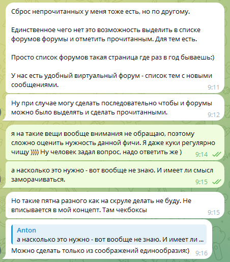 Я не помню, как это выглядело. У строки первая ячейка сейчас пустая. Ранее в ней была картинка папки. Если там были не прочитанные сообщения она была более выделенной, если сообщений не было - блеклой. Т.е. было бы хорошо как-то "подсвечивать" разделы, в которых есть сообщения, которые ты не прочитал. Так же была ссылка "Все разделы прочитаны". Если ее нажать - все папки разделов "блекли", де все прочитано. Вот как-то так. ![]() ... |