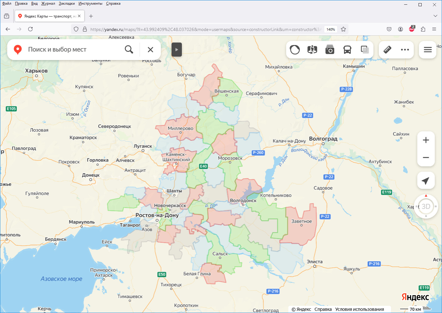 https://yandex.ru/maps/?ll=41.548448,47.791967&mode=usermaps&source=constructorLink&um=constructor:c67a3f3bb882d63ec2799107d5b632acced56b61c8172308680ed40de7f35788&z=7.36 Смешно, конечно. Но надоело искать карту административного деления каждый раз, когда надо посмотреть, где какой район. Недоделано. Нет четырех районов, три района хватаются из соседних областей (одинаковые названия), а один район состоит из двух кусоков (multigeometry), а яндекс это не понимает. Еще не знаю, как буду это решать. Ну и красоту надо будет навести. Внимание! Финальный вариант карты вот в этом посте 40139947. ... |