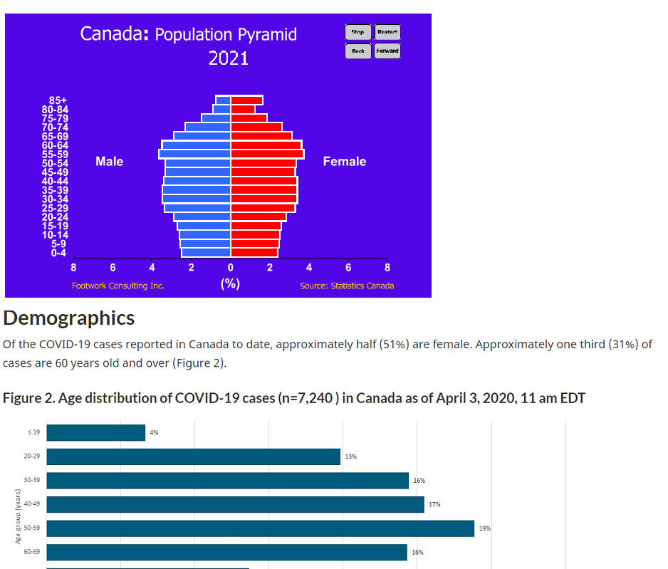 в РФ демография похожая, разница только, что до 30 лет - их значительно меньшая доля. Возрастные данные по ковиду не знаю где искать. Мне достаточно, что от специалистов инфекционистов слышно, что ур.см. не ожидается из ряда вон. А от простудных болезней доля см. - лишь часть по сравнению с другими причинами. Так что на их фоне ковид - случайная флуктуация. Зато есть ощущение, что наши СМИ выступают синхронно. Значит вероятен общий заказчик. Но странно, данные от ВОЗ по Канаде, опубликованные у нас, ещё на 2 апреля там число носителей ~10-11 тыс, а здесь написано 7тыс. на 3 апреля. Не иначе это с симптоматикой? или дата старая. ... |