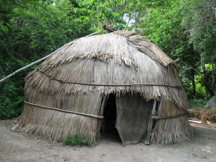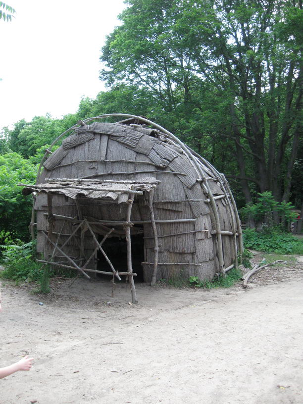 Далее мы отправились смотреть на быт поселенцев той эпохи. Для начала посетили индейскую деревню. Вот "Фиг-вам" масачусецкова разлива, построеный из коры. ... |