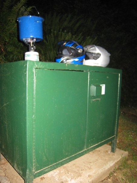 Железная коробка в national park - туда нужно прятать еду от медведей. Сверху стоят кастрюльки на горелке и две шлемокаски. Кастрюлька слева. ... |