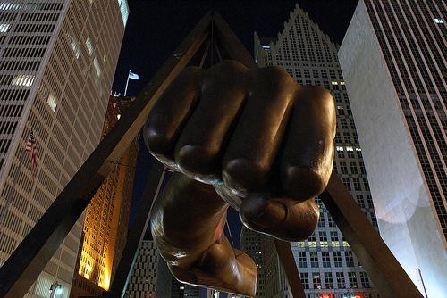 Joe Louis Fist Woodward and Jefferson Avenues Detroit, MI 48243 Это адресc. а вот тут он хорошо виден на карте. ... |