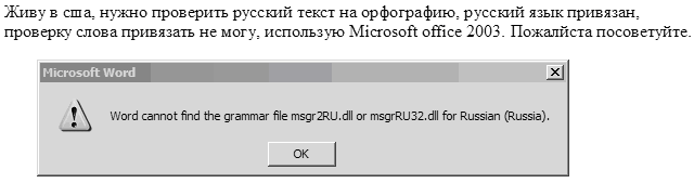 Живу в сша, нужно проверить русский текст на орфографию, русский язык привязан, проверку слова привязать не могу, использую Microsoft office 2003. Пожалйста посоветуйте. ... |