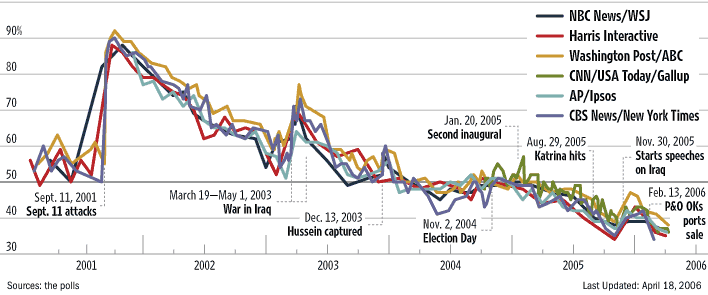 Кстати, тенденция, судя по этому графику, была такова - что Буш без войны в Ираке имел к выборам рейтинг 30-40%...Ну а про влияние на него 9-11 даже и говорить не хочется... ... |