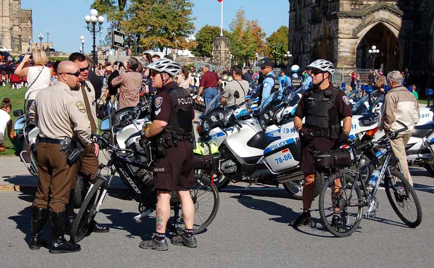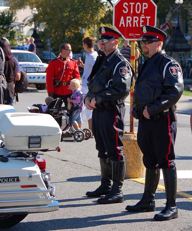 Там среди зрителей толкались такие колоритные байкеры как я их себе представляю - здоровые, в кожанных куртках с нашивками с бородами и татуировками. Так вот полицейские мотоциклисты почемуто выглядели почти один в один - такие же мордатые, пузатые, бородатые в кожанных куртках с нашивками и черных очках ... |