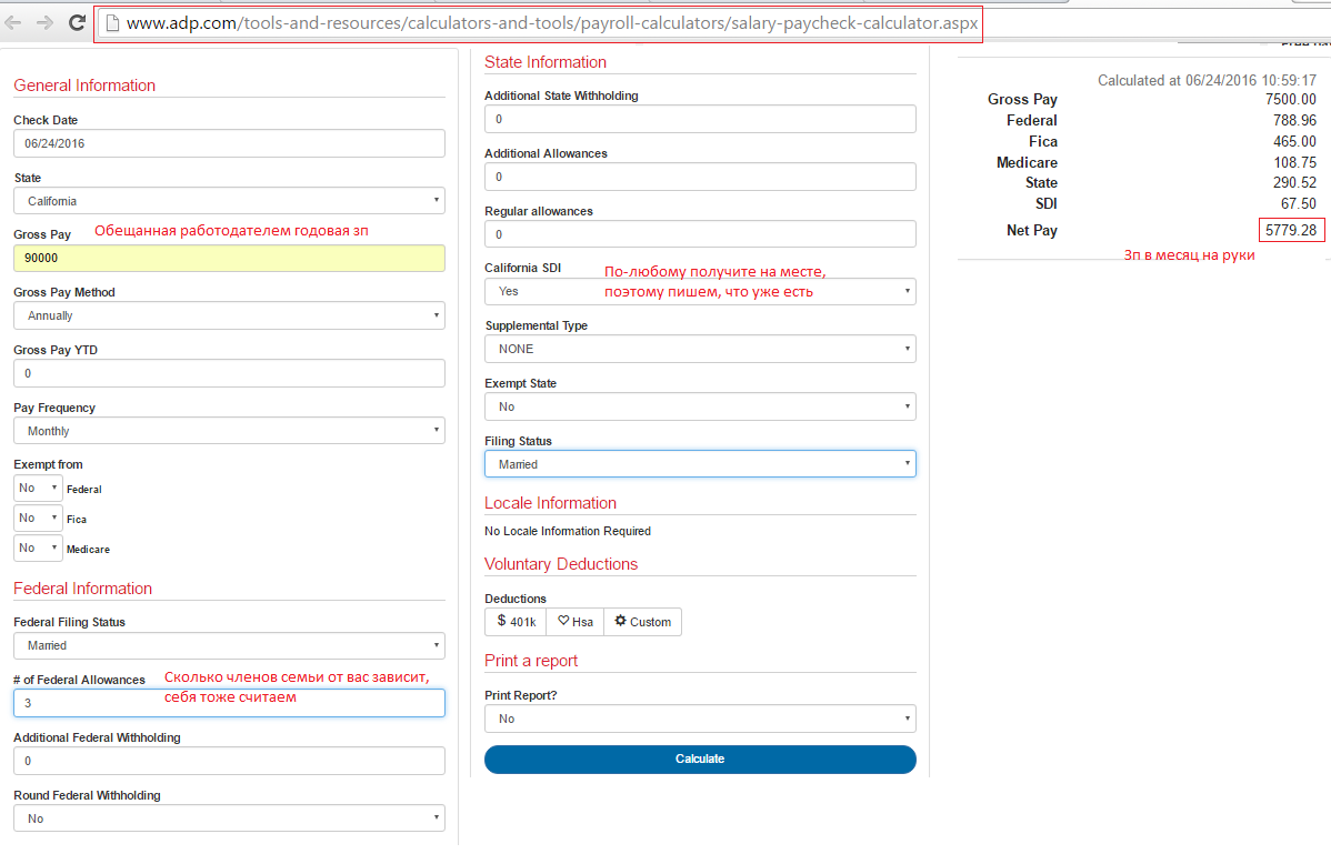 Всем спасибо за советы. Нашёлся тут по знакомству уроженец Санты-Барбары ( ), который любезно сегодня за утренним кофе уточнил все мои вопросы. Подвожу итоги по теме.Итак, считаем налоги http://www.adp.com/tools-and-resources/calculators-and-tools/payroll-calculators/salary-paycheck-calculator.aspx Прилагаю картинку как правильно заполнить. При моих входных 90к, пока не работающем муже и ребёнке у меня осталось примерно 5780 чистыми в месяц. Аренду в Ирвайне лучше смотреть здесь IrvineCompanyApartments.com, там монополия у них. Да, в среднем будет около 2к в месяц, т.к. с ребёнком только двухспальные апартаменты нужно брать по их законам. Мобильная связь. Если смартфон да ещё и с интернетом, вполне 100 баксов в месяц может получиться. Оператора посоветовали вот этого http://www.att.com/. Получается 40$ сам сервис, 30 за инет, 10-20 разговоры. В принципе можно экономить и жить без инета в телефоне. Интернет дома порядка 50 долларов. Коммуналка. Американец тож удивился на счёт 300 баксов в мес, согласно блогу. Предположил, что круглосуточно гоняют кондиционер. Можно уложиться в половину. Еда за 1000$ на семью - тоже много, если даже бытовую химию учесть. Короче, сказал если буду готовить дома, в 700-800 точно уложусь. Таскать контейнеры с едой на работу там зазорным не считается. Машина. Подтвердил мои мысли о том, что старше 5 лет не брать, страховка выходит дорого. За 10к найти можно вполне приличный вариант, нужно торговаться. Вообще лучше брать в северных штатах и не платить 10% налог на покупку в калифорнии. Так и сделаю. Как раз там мои знакомые и кучкуются, которые тачки сюда отправляют. Покупка машины тут оффтопиком идёт, если кому нужны контакты, обращайтесь в личку, машину можно будет забрать в Выборге а выбрать лучше на e-bay (это если кому пригнать). Страховка на авто 100$, бензин 200$ (ну тут уж совсем опционально) С садиками прояснить не смог, т.к. для своих у них всё нахаляву. Слышала, что можно найти там русское сообщество, самое простое оставлять кому-то из своих, кто уже сидит с дома со своими детьми, за вменяемые деньги. Со временем думаю всё же найдём частный preschool. Ещё вот такие штуки есть https://www.facebook.com/Russian-Daycare-Kids-Room-Irvine-495331343983296/. При чём нужно понимать, что в DayCare просто присмотр и игры, обучения как такового нет. Если нужно чтобы занимались, надо искать Preschool. По медстраховке. Подтвердил, что обращение взрослого всегда оплачивается (20-50$), зависит от условий страховки, детям большие скидки, практически бесплатно по страховке должно выходить. Это немного успокоило. В общем, нормальный работодатель у меня. ( Не Epam ![]() По поводу визы L1, имейте в виду, вы должны за последние три года проработать в этой компании как минимум 2 года. чтобы иметь возможность релоцироваться. (поэтому муж у меня всё равно будет искать работу уже на месте по L2) Спасибо за внимание. ... |