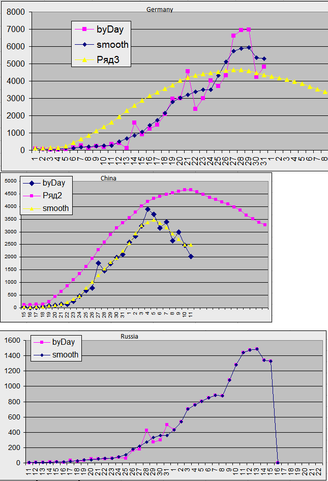 Спойлер Вы "наши зарубежом", я для вас зарубежом, поэтомуданные взял по нашей офф. ссылке на роспотребнадзор - там ежедневно кладут docx-файлы о ходе роста за предыдущий день по каждой стране. Неудобно, что тренд можно получить тоько выдёргиванием из каждого файла поочереди. Как и ожидают специалисты, пик вполне прогнозируем. Хоть в каждой стране свои особености учёта (и свои причины для манипулирования), опираться больше не на что. Я не эпидемиолог, так что смотрю с т.зр. трендов, надеясь, что движущие причины явления в странах похожи. Кладу рисунок (ФРГ Китай Россия). РФ - не окончательный прогноз, его я сделал по модели ФРГ, вручную синхронизировав начало отсчёта (у обоих это март, для сравнения с Китаем - там отрезок январь-февраль). РФ пока отстаёт от передовых стран, а регионы - от Москвы, в которой примерно 3/4 -- 2/3 всех обнаруженных заражений. Сейчас в РФ по СМИ должно считаться 2337(501 новых на сегодня, и всего 17 умерших). Но если после Москвы волны пойдут по регионам ... ... |