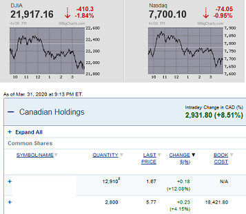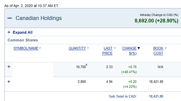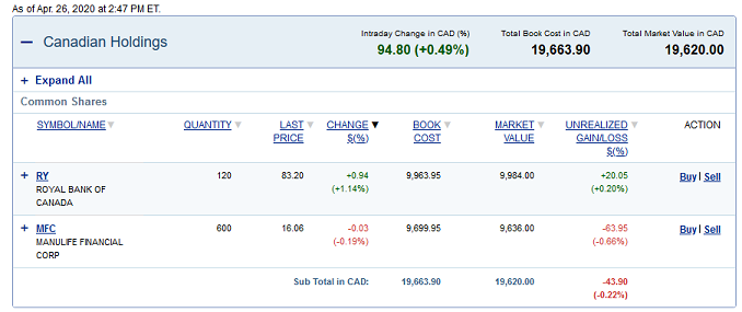ViPRos, Что значит торгануть? Из меня торгаш никакой... Я мыслитель... вот по прошлому кризису первыми выходили банки и финансовые структуры.. потом все остальные. Но тут такая ситуация что в прошлые кризисы падение было продолжительней почти несколо месяцев, а тут только месяц прошел, так что я мыслю что не стоит рисковать. Но... жадность свое берет, прикупил акций банка и одной финасовой конторы - у них дивиденты хорошие. Если не смотреть на падение и сидеть на дивидентах, то как раз то. Вот точто можно закупать сейчас. ВОт список брал отсюда: https://www.mackenzieinvestments.com/en/products/mutual-funds/mackenzie-canadian-dividend-class#01598 Toronto-Dominion Bank/The Canada|Diversified Banks 7.19% Royal Bank of Canada Canada|Diversified Banks 6.80% Bank of Nova Scotia/The Canada|Diversified Banks 6.35% Manulife Financial Corp Canada|Life & Health Insurance 3.99% Shaw Communications Inc Canada|Cable & Satellite 3.81% Canadian National Railway Co. Canada|Railroads 3.36% Enbridge Inc Canada|Oil & Gas Storage & Transport 3.19% Open Text Corp Canada|Application Software 2.94% Suncor Energy Inc Canada|Integrated Oil & Gas 2.75% Bank of Montreal Canada|Diversified Banks 2.74% ... |