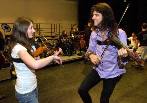 SandalTree Не далее как вчера посетили концерт "Транс-Сибирского Оркестра" - TSO. Я впервые присутствовал на рок-концерте такого рода, это вам не Вуячич.... Коротко: Можете себе представить железобетонный сплав Ванессы Мэй, Металики и Луи Армстронга? Так вот это оно и было. Исполнялась классика и народные напевы, пели песни и рассказывали стихи, носились по залу с бешенной скрипкой и летали на гитарах под потолком.... Марк Вудс - скрипач исполнитель и композитор, ударник, 2 гитариста и 1 солист. Они провели несколько уроков, а потом дали 2 концерта вмести со школьным оркестром. Это было забавно. Как сказал СандалТрее, это вам не Вуячич, что в переводе на язык учителя музыка нашей школы - it's not your grandma's orchestra anymore! Они играли Led Zeppelin, много Макартни, что-то Jimi Hendrix и что-то еще написаное Марком Вудс. Мне понравилось, что это было не просто выступление профессиональных музыканотов, а то, что они играли вместе со студентами. Студенты были и солистами, и играли дуэтом с Марком, ну и конечно целым оркестром. Эмоций - море! Школьники готовились долго. В дни, когда Марк Вудс был в школе, их освободили от всех остальных уроков, чтобы они могли подготовится к выступлению. Вот так у нас в школе проходят уроки музыки. :) ... |