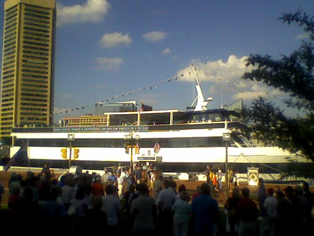 В начале сходки было всего человек 30-50. Полицаи сказали разойтись. Я приношу своё извинение памиру, рублю и прочим.... и констатирую - свободы слова, в "нашем" понимании здесь нет. Вот что-бы сделали в России или Беларуси если-б к группе протестантов подошли трое-четверо ментов и приказали разойтись иначе арестуют? Правильно, остались-бы стоять. Ведь это "по нашему", это-же и есть "борьба за идею" которая закаляет. Здесь менталитет другой. Организаторы повели народ вдоль по набережной к туристическому центру. Как оказалось, ранее подали заявку на участие, но мэрия наложила запрет на акцию. Якобы потребовали 2000 баксов именно за это место. У организаторов таких денег не оказалось, поэтому место было занято рекламой нового самсунговского телефона. Вобщем, "по нашим меркам", организаторы повели себя крайне оппортунистически. То-ли дело если-б по всей Америке заголовки праздничных газет пестрели надписями что "в Балтиморской акции неповиновения арестовано 50 человек".... но Балтимор и есть самый оппортунистический город со времён гражданской войны. Вобщем переехали мы к турцентру. Напротив митинга стоял пароходик, на котором вдруг "неожиданно" заиграла музыка и ораторам пришлось её перекрикивать, организаторы-таки договорились и музыка заткнулась. На фотке начало митинга, народу ещё человек 100. ... |