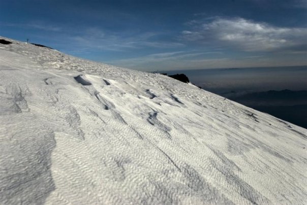 Вокруг кратера шли ещё час, уже под солнцем. Оно топило снег и мы начали в него проваливаться. Этот последний час был самым тяжёлым, хотя и самым пологим. ... |