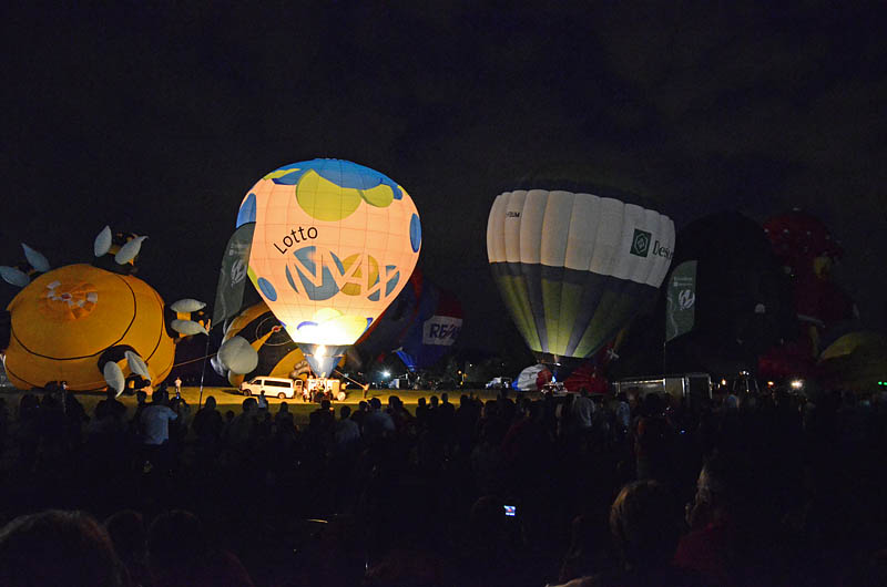 Вечером воздухоплаватели привезли свои шары снова на поляну, откуда вылетали. Дождались темноты, снова надули шары, но карзины видно прикрепили к замле, и время от времени включали свои горелки - в темноте пламя выглядело очень ярким и зорошо освещало сами шары. И так наверное целый час а то и два. Мне не очень понравилось. ... |