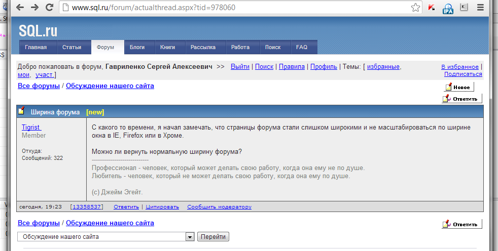 С какого то времени, я начал замечать, что страницы форума стали слишком широкими и не масштабироваться по ширине окна в IE, Firefox или в Хроме. Можно ли вернуть нормальную ширину форума? ---------------------------- Профессионал - человек, который может делать свою работу, когда она ему не по душе. Любитель - человек, который не может делать свою работу, когда она ему по душе. (c) Джейм Эгейт. ... |