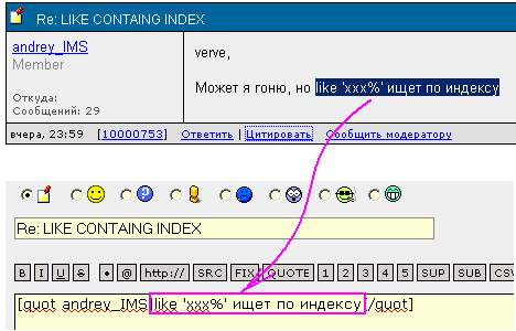 цитирование выделенного фрагмента очень даже адекватное и логичное решение. Чего, к сожалению, не скажешь, например, о предложении реализовать данную возможность самостоятельно, на клиенте. В то,что это было сказано серьезно, верить как-то не хочется. ... |