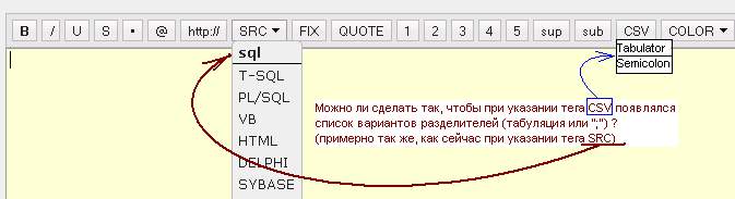 hi all Сабж: когда надо привести табличные данные, то указание тега CSV недостаточно - надо еще добавить '=t'. Если забыть это сделать, то вместо таблички будет каша. Можно ли упростить это примерно так, как показано в иллюстрации ? ... |