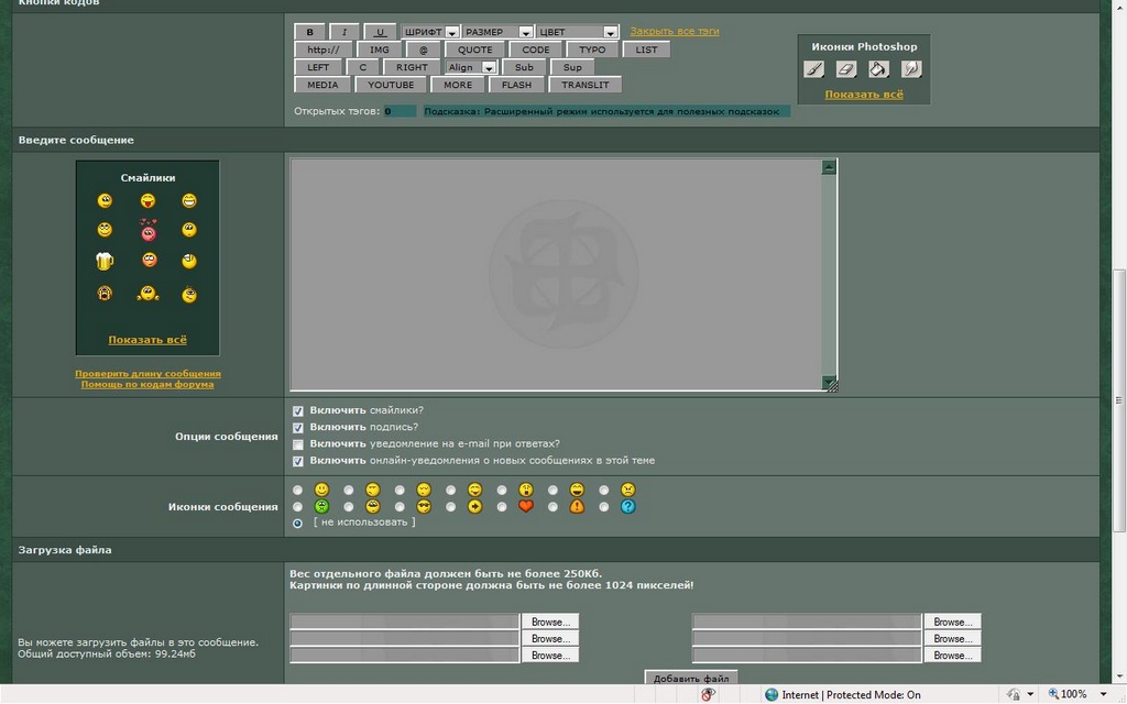ScareCrow автор Например картинки можно приложить не в конце, а в любом месте сообщения. Можно сделать отдельную кнопку заливки файла, и по факту загрузки вставлятьс готовым адресом в редактор (на месте курсора). Сам файл хранить в базе или перебрасывать, например, на radikal.ru, он вроде без капчи. ... |
