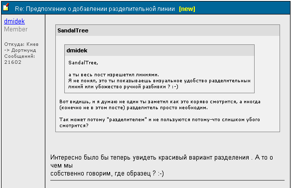 dmidek SandalTree, а ты весь пост изрешетил линиями. Я не понял, это ты показываешь визуальное удобство разделительных линий или убожество ручной разбивки ? ![]() Так может потому "разделителем" и не пользуются потому-что слишком убого смотрится? 2 Рустам Я всё понимаю, но ведь ты-же не огласишь список критериев по которым оцениваются "нововведения". Пока-что я знаю только один критерий - одобрение "кастой" Это предложение "не одобрено", а значит будет выброшено на свалку и всем остальным предлагальщикам будут даваться ссылки на этот топик. А чё, удобно, чем не фича. ... |