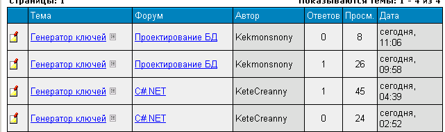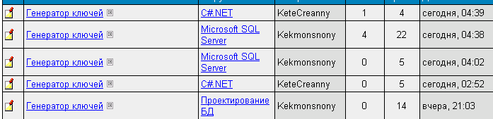 Гаджимурадов Рустам, сегодня ночью нонейм заспамил однотипную тему "Генератор ключей" в несколько разделов. Я отписался по этому поводу в разделах "SQL Server" и "C#", добавил в разделе "SQL Server" картинку подтверждающую факт спама (идет ниже) и обратился к модератору того раздела. Далее с большой вероятностью тот же нонейм (примерно через 1 час) создал тему в разделе C#, содержащую в названии и содержимом ненормативную лексику. Я по этому поводу обратился к модератору раздела C# и дополнительно обратил его (модератора) внимание, на возможность принадлежности одного автора как к этой теме, так и к темам "Генератор ключей". Результат: тема "Генератор ключей" удалена только в разделе "SQL Server", а тема с ненормативной лексикой в разделе "C#" была удалена минимум через 6 часов. Вопрос: как добиться максимального эффекта при минимальных телодвижениях? картина ниже создана сегодня в 4:44 ... |
