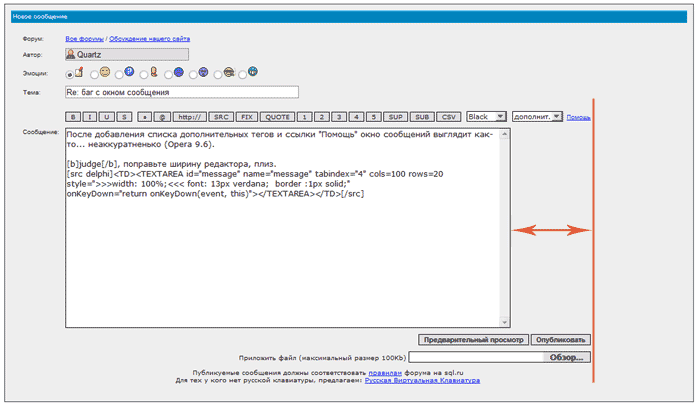 После добавления списка дополнительных тегов и ссылки "Помощь" окно сообщений выглядит как-то... неаккуратненько (Opera 9.6). judge, поправьте ширину редактора, плиз. Код 1. 2. 3. ... |