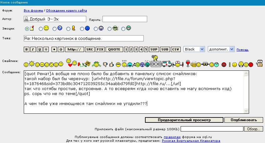 А вобще не плохо было бы добавить в панельку список смайликов: такой набор был бы черезчур: http://tfile.ru/... так что хотябы простые, встроеные. А то все время кгда хочю вставить не магу вспомнить код) ps. сорь что не по теме ... |