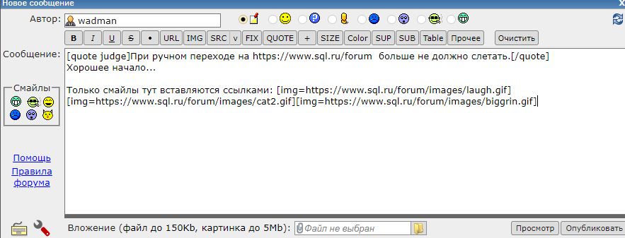 judge При ручном переходе на https://www.sql.ru/forum больше не должно слетать. Смайлы теперь вставляются ссылками:В старой версии - как раньше. ... |